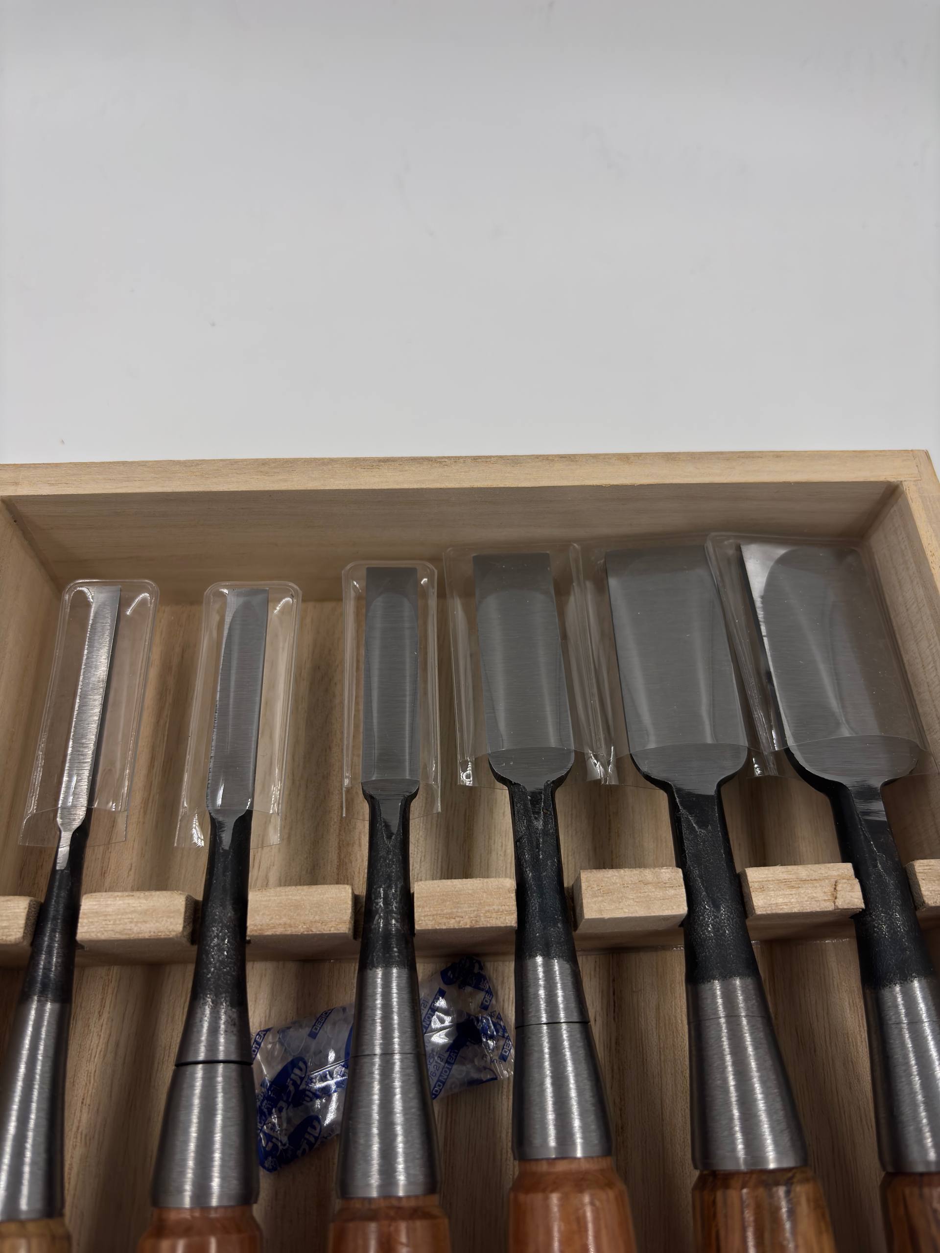 В наборе стамески 6-ти размеров : 6мм, 9мм, 12мм, 18мм, 24мм, 30мм